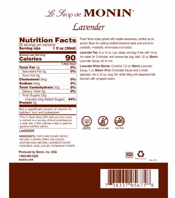 Ingredients: Pure Cane Sugar, Water, Natural Flavours, Spirulina (Color), Xanthan Gum, Natural Lavender Flavour, Vegetable Juice (Color), Potassium Citrate.
